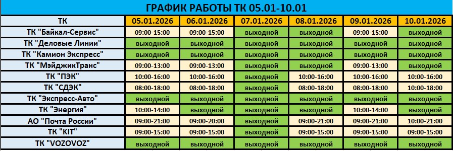 График работы Транспортных Компаний (ТК) с 05.01.2026 по 10.01.2026 в г. Набережные Челны!!!